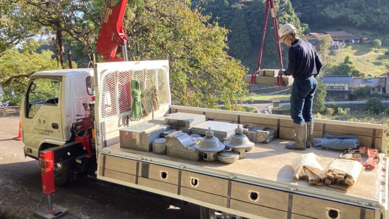 石材クランプ、スリングベルトを使い安全に丁寧に搬出していきます✨