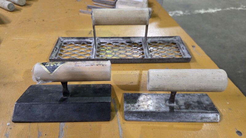 こちらは網鏝(奥)と面取り鏝(手前)になります。奥の網鏝はコンクリートに含まれる骨材(砂利)は打設時に表面に浮いてきやすいもので、それを沈めるために使いましてこれを行うことでコンクリートの密度を高めます。