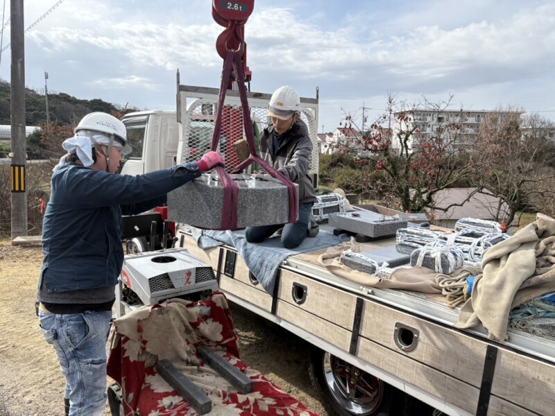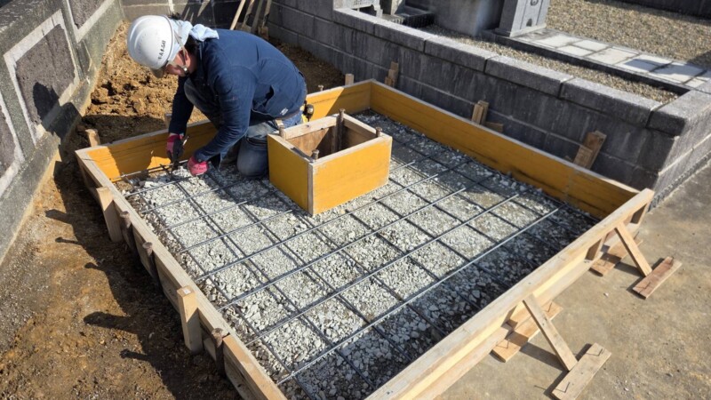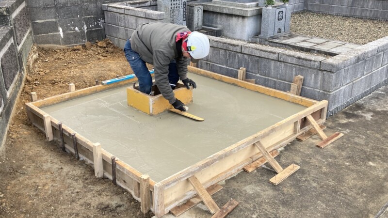 しっかりとした基礎コンクリートを打設し、数日間しっかりと硬化させてから、墓石の建て工事へと移っていきます。